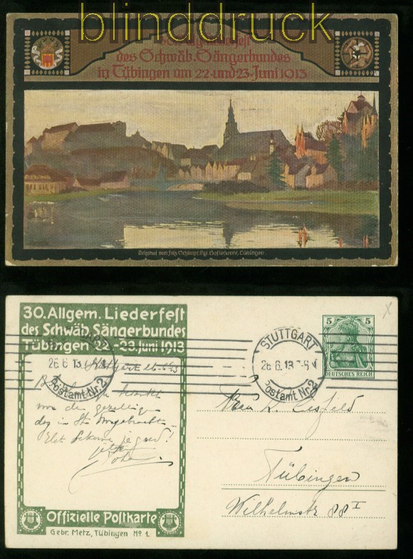 Deutsches Reich Privat-GSK PP 27 C 186 / 01 Stuttgart Liederfest Sängerbund 1913 5 Pfg. Privat-Ganzsachenkarte Germania 30. Allgemeines Liederfest des schwäbischen Sängerbundes Tübingen 22.-23. Juni 1903 offizielle Postkarte Karte gelaufen aus Stuttgart 26.6.1913 nach Tübingen Erhaltung siehe Scan