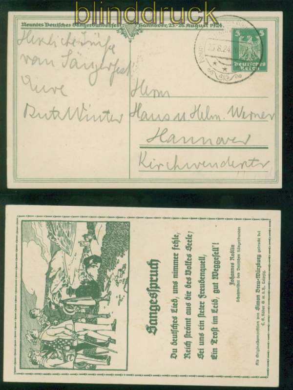 Deutsches Reich Privat-GSK PP 81 C 3 / 01 gestempelt Sängerbundesfest Hannover 1924 Privat-Ganzsachenkarte Neuntes Deutsches Sängerbundesfest Hannover 23.-26. August 1924 Sangesspruch von Johannes Redlin Karte gelaufen mit Ausstellungs-Sonderstempel 25.8.1924 als Ortspostkarte Hannover Erhaltung siehe Scan