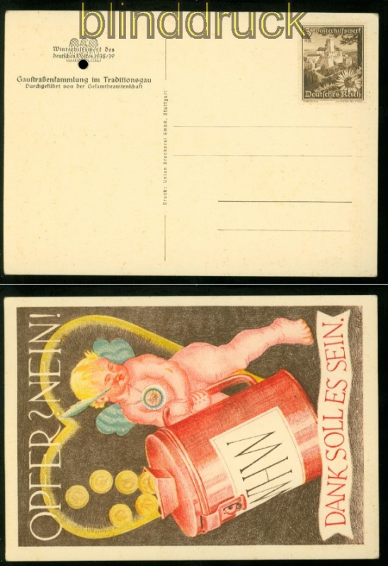 Deutsches Reich WHW Strassensammlungskarte 1938/ 39 ungebraucht Gaustrassensammlung im Traditionsgau br> durchgeführt von der Gesamtbeamtenschaft frankiert aber nicht gelaufen Erhaltung siehe Scan