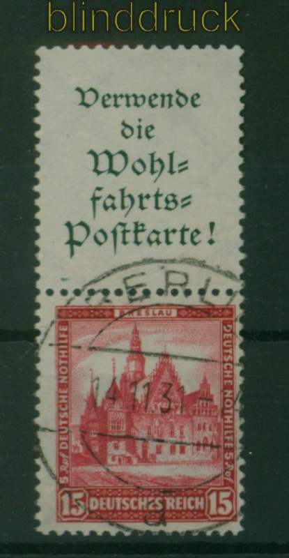 Deutsches Reich Zusammendrucke Mi # S 96 gestempelt Nothilfe 1931 Nothilfe 1931 senkrechter Zusammendruck 15 + 5 Pfennig mit Reklamefeld: Verwende die Wohlfahrtspostkarte gestempelt Erhaltung siehe Scan