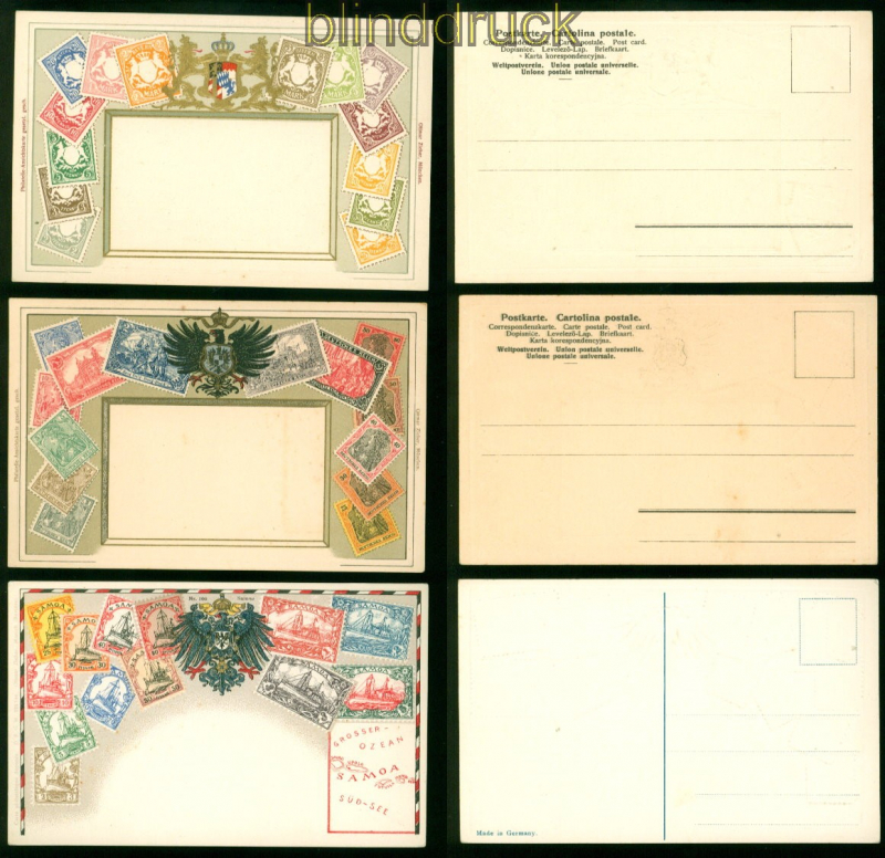 Deutsches Reich drei farb-Präge-AK mit Abbildungen Deutscher Briefmarken Samoa, Bayern und Germania ungebraucht drei alte schöne farbige Präge-Ansichtskarten mit Abbildungen Deutscher Briefmarken folgender Gebeite: Samoa, Bayern und Marken aus der Germania-Zeit ungebraucht Erhaltung siehe Scan