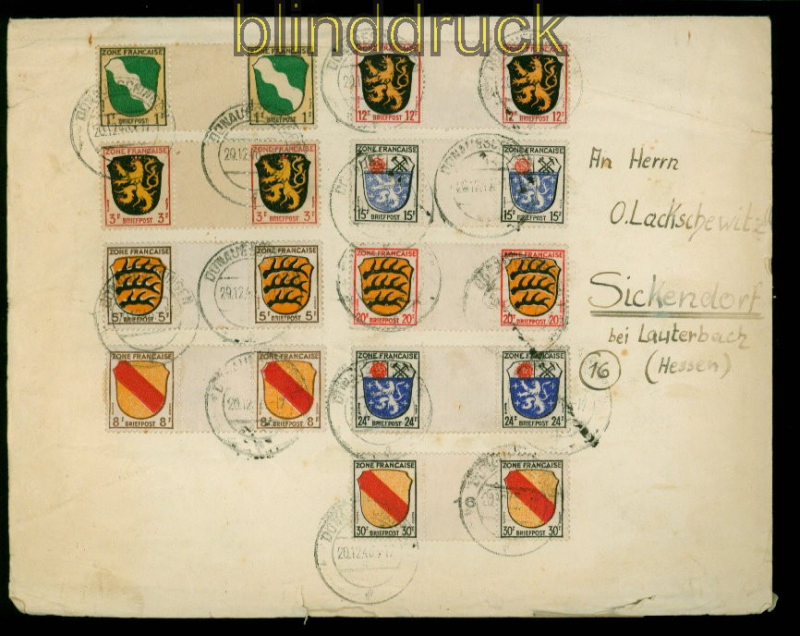 Französische Zone Allgemeine Ausgabe Mi # 1/10 Zw ohne # 5 auf Brief Donauschingen 1946 ein bis 30 Pfennig in Zwischenstegpaaren ohne die Mi # 5 (10 Pfg.) auf großformatigen Brief aus Donaueschingen 29.12.1946 nach Sickendorf Erhaltung siehe Scan