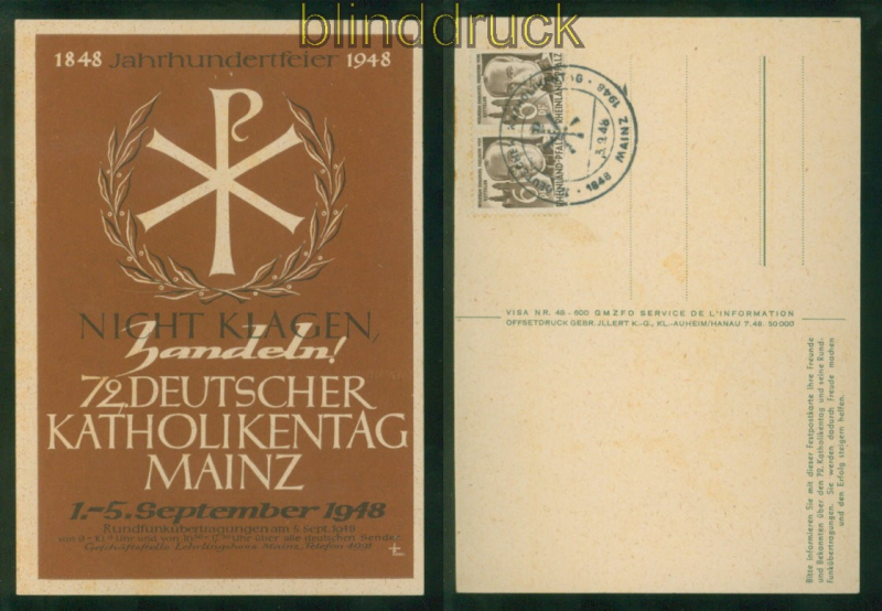 franz. Zone Rheinland-Pfalz Mi # 17 waagerechtes Paar AK 72. Katholikentag Mainz 1948 6 Pfennig Ketteler als waagerechtes Paar blanko gestempelt mit Sonderstempel auf Ansichtskarte zum 72 Deutschen Katholikentag 1948 in Mainz Erhaltung siehe Scan
