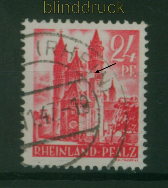 französische Zone Rheinland-Pfalz Mi # 8 III gestempelt mit Plattenfehler III 24 Pfennig erste Ausgabe mit Plattenfehler III: großer Fleck im rechten Domturm gestempelt Erhaltung siehe Scan