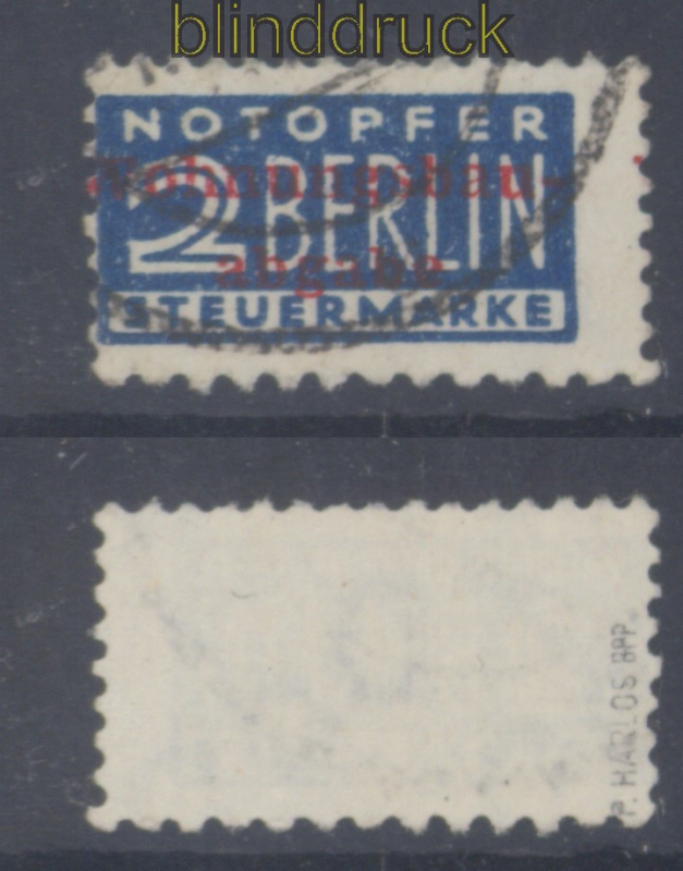 französische Zone Württemberg Wohungsbauabgabe Mi # 2aBBW gestempelt gepr. Harlos BPP 2 Pfennig Zwangszuschlagsmarke gezähnt K 11 1/4 : L 12 (Kombinationszähnung) Wasserzeichen 1 W Aufdruck in rot gestempeltes Prachtstück signiert P. Harlos BPP gute Erhaltung siehe Scan
