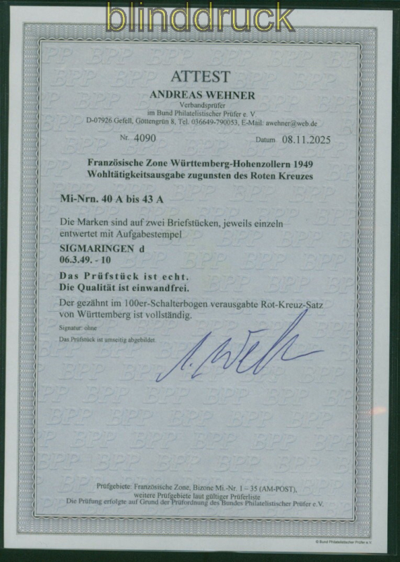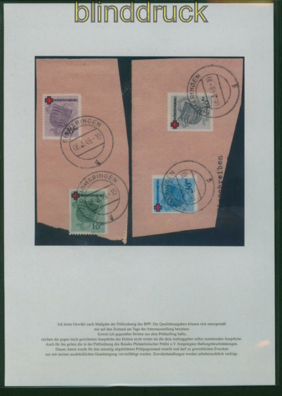 Französische Zone Württemberg Mi # 40/43 A gestempelt Fotoattest Wehner BPP Deutsches Rotes Kreuz DRK komplette Ausgabe gestempelt Fotoattest Wehner BPP: ".... Prüfstück ist echt, die Erhaltung ist einwandfrei" Erhaltung siehe Scan